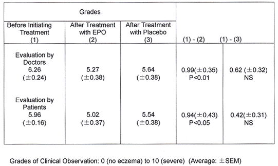 EPO produced no side effects among the adults or children. The patients who took EPO orally showed significant improvement in subjective and objective findings observed by the patients and the doctors. (See the table below)